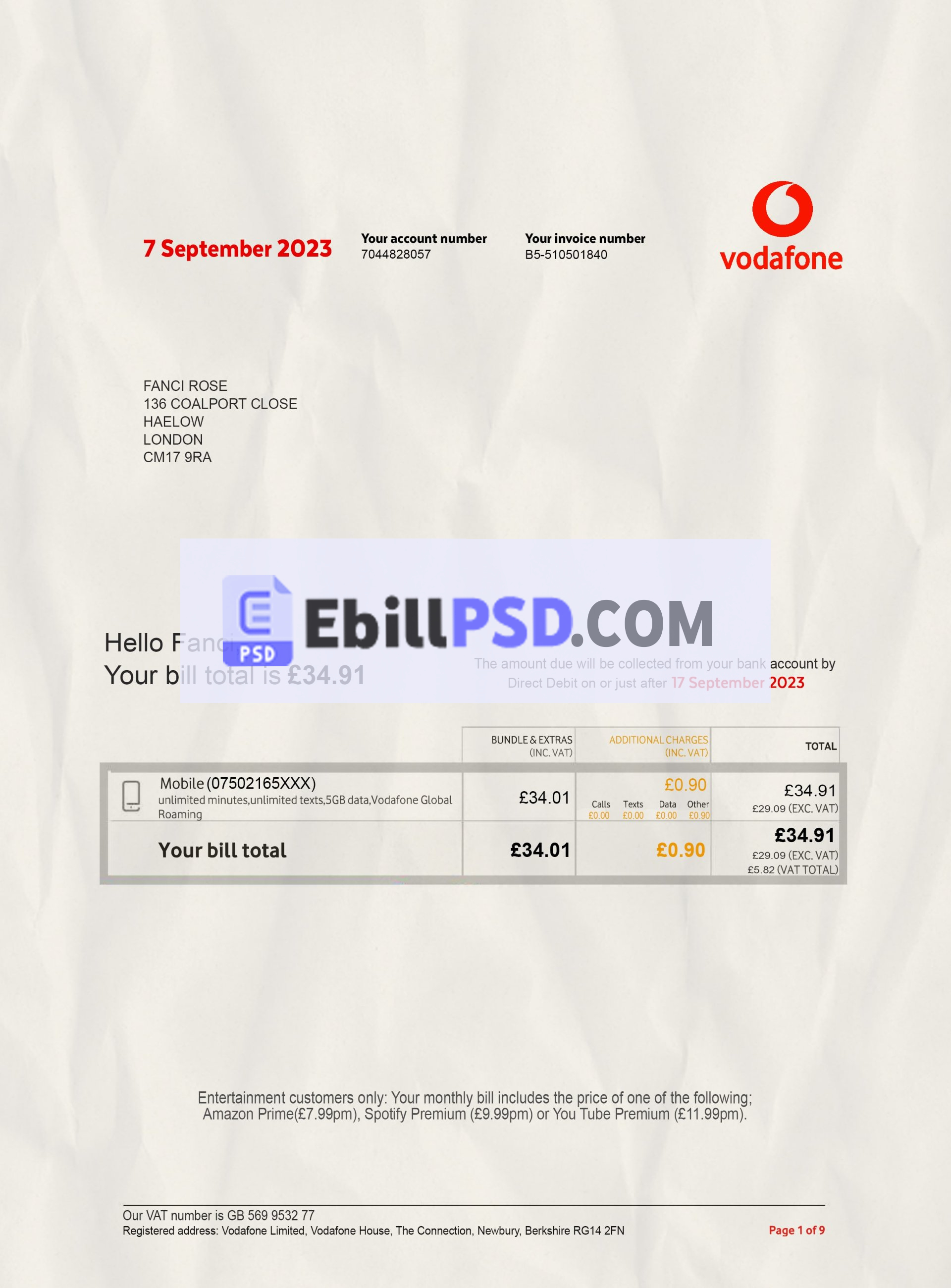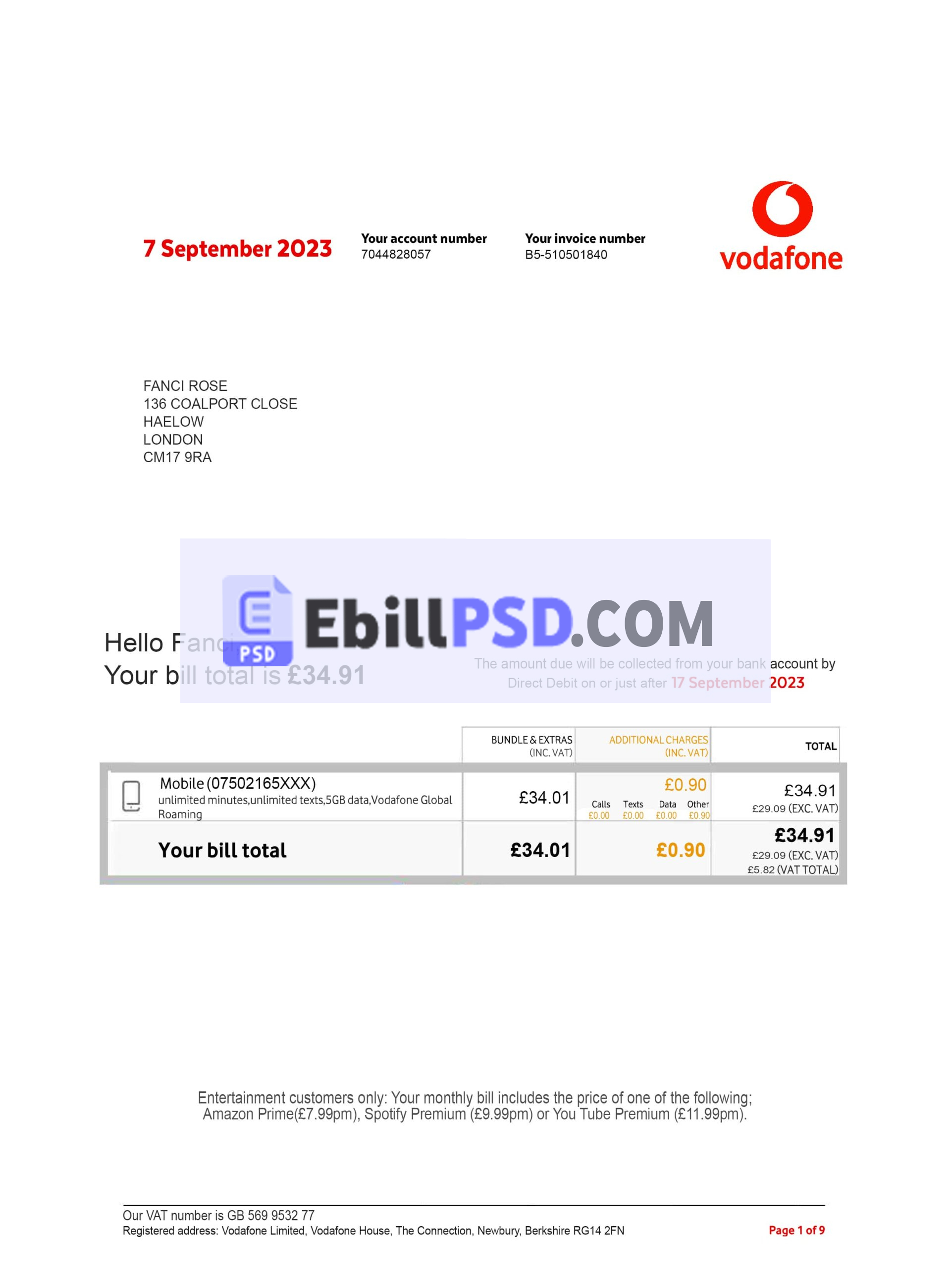 Vodafone Phone Mobile Bill UK PSD Template 2022 Download For a Cheap Price
